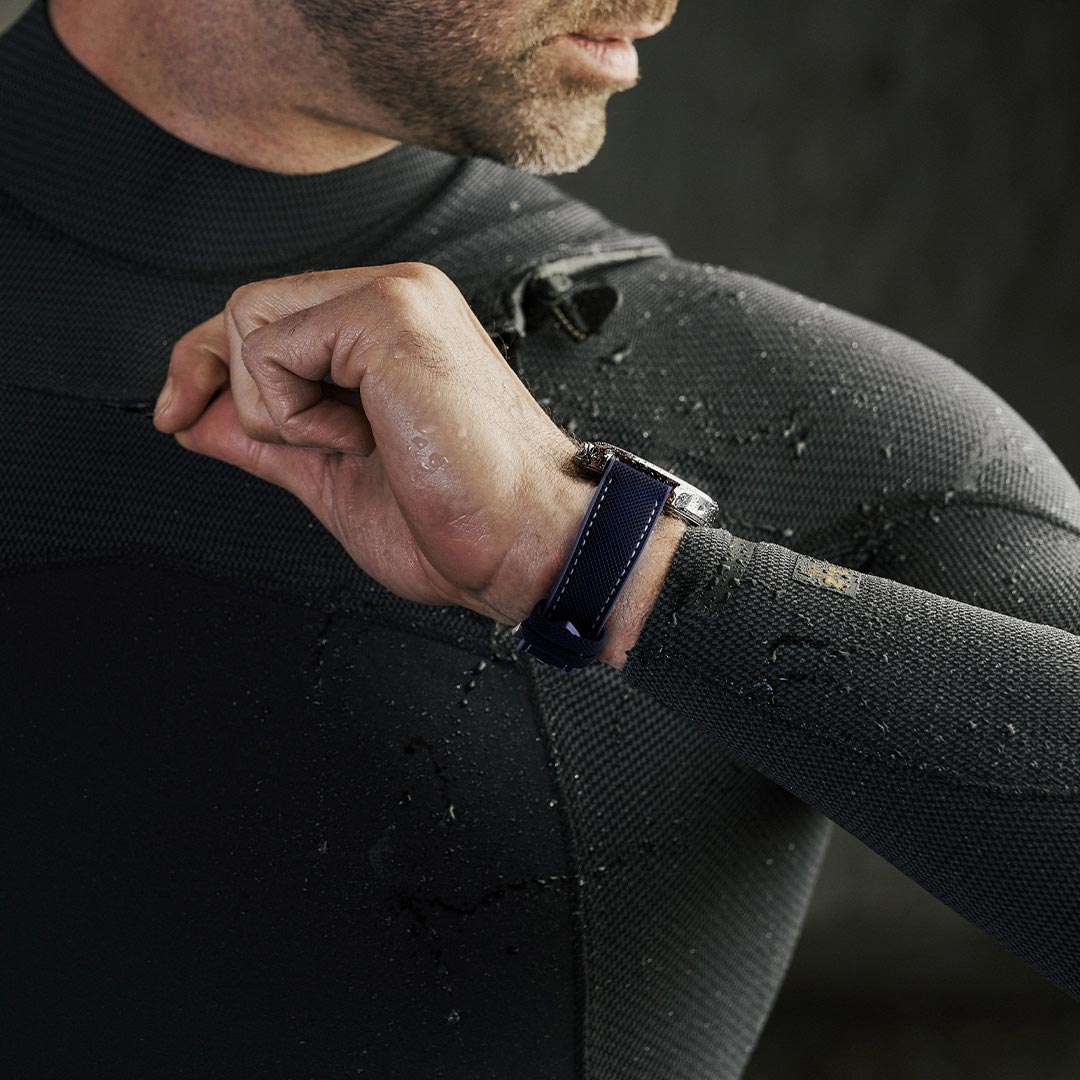 A waterproof rubber dive watch strap must be able to withstand prolonged immersion, pressure changes, and repeated exposure to salt and UV rays. Unlike leather or steel straps, rubber is 100% waterproof and resistant to saltwater, making it the perfect choice for a sporty strap built for deep dives. Its design prevents water from seeping in and maintains constant flexibility, avoiding any risk of stiffening or cracking after multiple dives. Thanks to its composition, it does not become heavy when wet and retains excellent flexibility, essential for a perfect fit on the wrist.