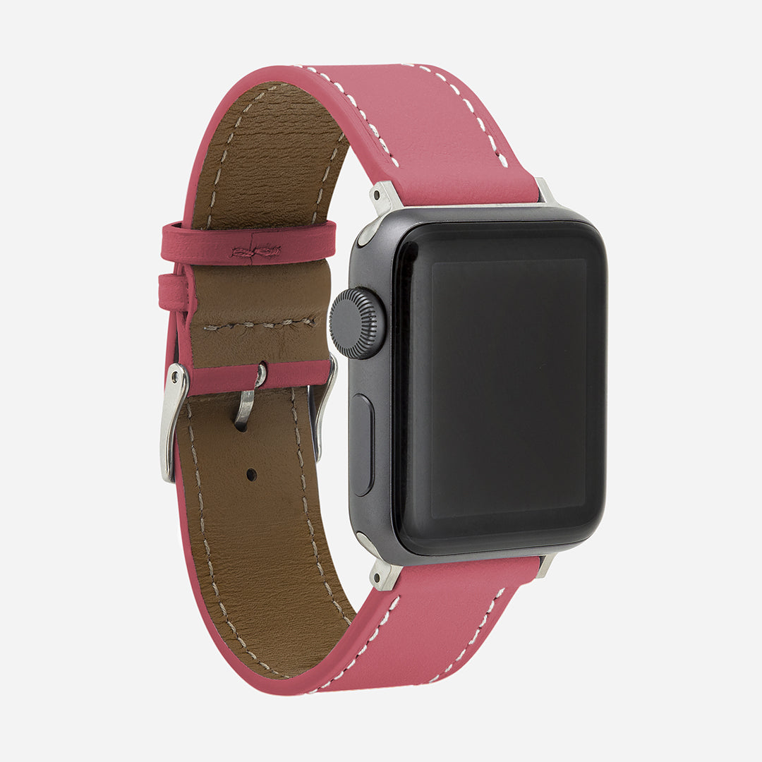 Le bracelet Apple Watch en cuir pour femme est né de la recherche et du développement des artisans horlogers Maison Fèvre. Inspirés par la créativité minimaliste Apple, les bracelet cuir Apple Watch pour femme ont tout pour plaire. Pour répondre aux exigences de qualité française, le bracelet Apple Watch jaune ou rose signé Maison Fèvre allie la matière noble d'un cuir lisse à des surpiqûres contrastantes dont les coloris sont divers comme les rose, marron, orange, jaune, rouge, vert foncé, parme, noir. Le bracelet Apple Watch en cuir pour femme Le Simple Tour, comme le bracelet Apple Watch orange, peut se porter avec une tenue d’été composée d’un tailleur pantalon haute couture beige, de même ton que le bracelet montre Apple Watch femme simple tour Maison Fèvre.